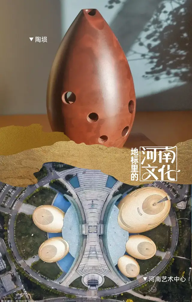 大剧院、音乐厅、小剧场、美术馆、文化馆分别位于五个椭圆体中,其造型并非来源于“金蛋”,而是由河南出土的 6500 年前古代乐器陶埙造型演变而来。