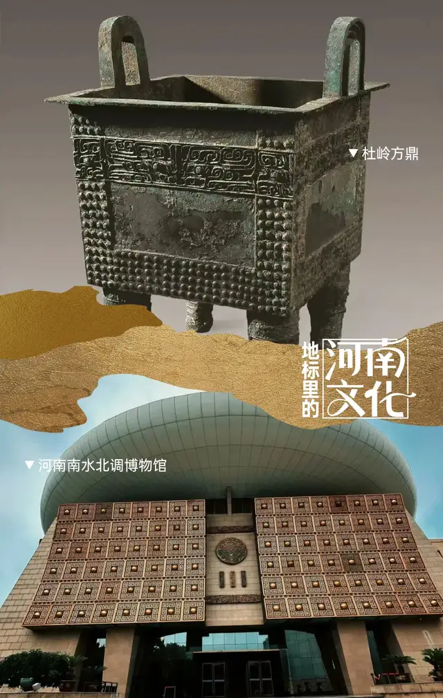 1999年底建成的郑州博物馆老馆(现改为河南南水北调博物馆)以郑州出土的商代青铜方鼎为造型的原始基础,配以圆形碟状屋顶,取“天圆地方、鼎立中原”之寓意。郑州出土的商鼎中,以硕大的杜岭方鼎最为著名。