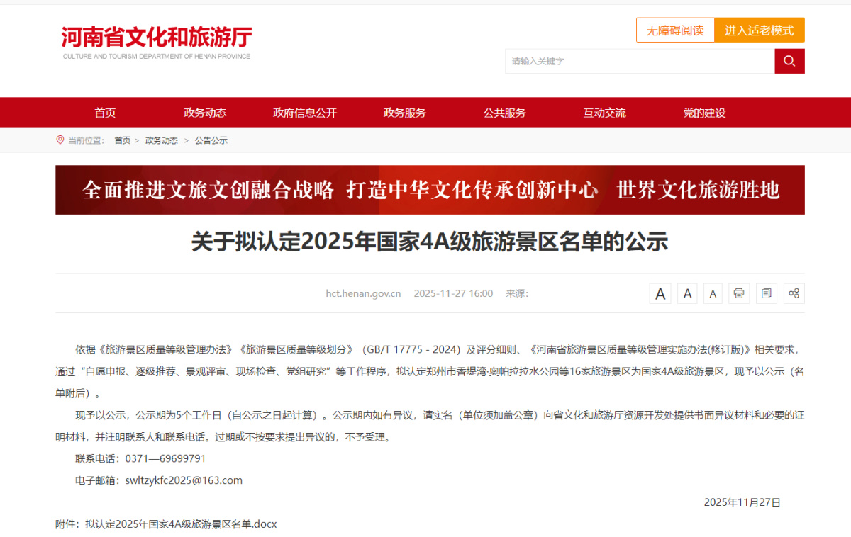 公告显示,依据《旅游景区质量等级管理办法》《旅游景区质量等级划分》(GB/T 17775-2024)及评分细则、《河南省旅游景区质量等级管理实施办法(修订版)》相关要求,通过“自愿申报、逐级推荐、景观评审、现场检查、党组研究”等工作程序,拟认定郑州市香堤湾·奥帕拉拉水公园等16家旅游景区为国家4A级旅游景区。