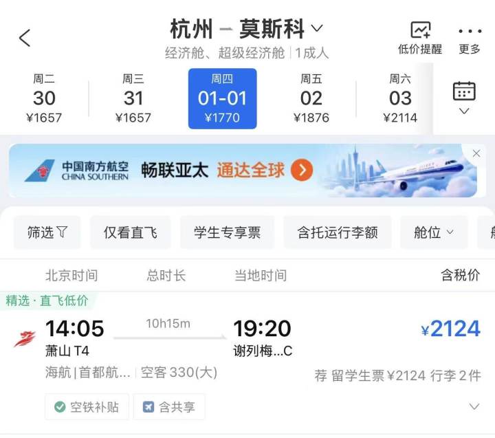 目前,杭州萧山国际机场已开通至莫斯科的直飞航班,航程约10小时。