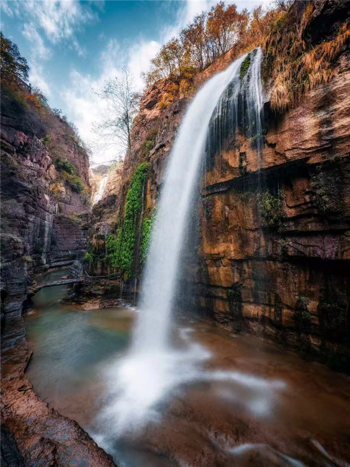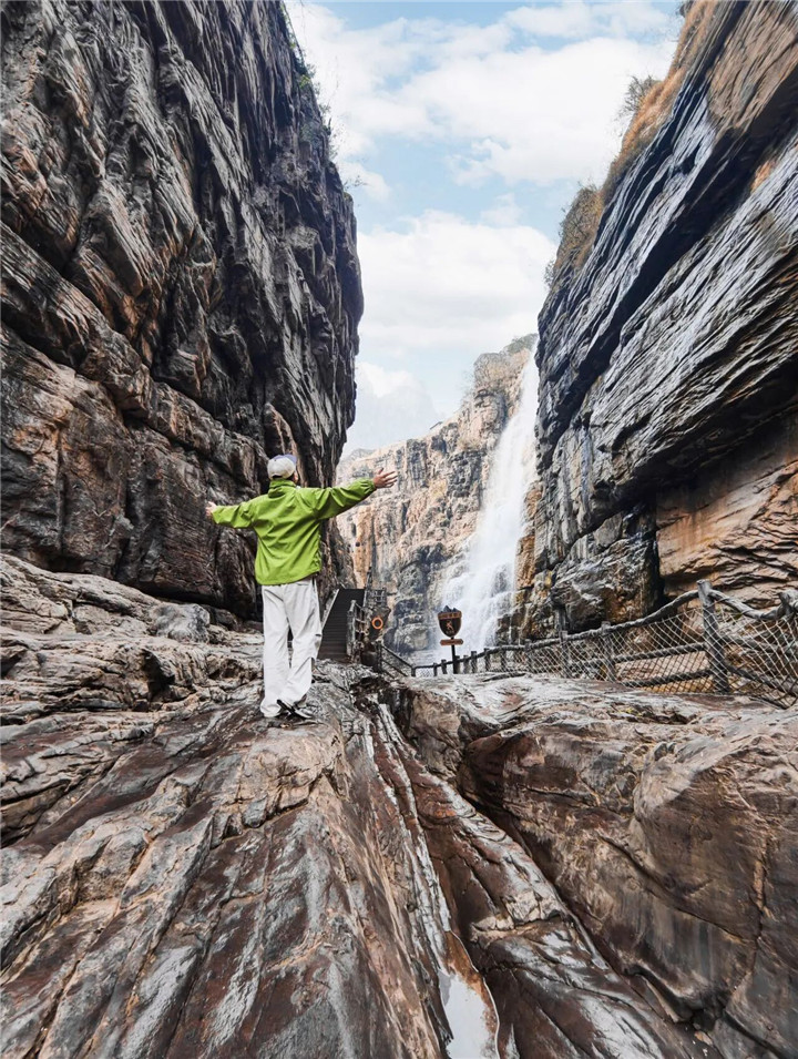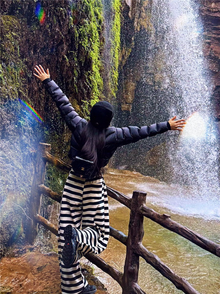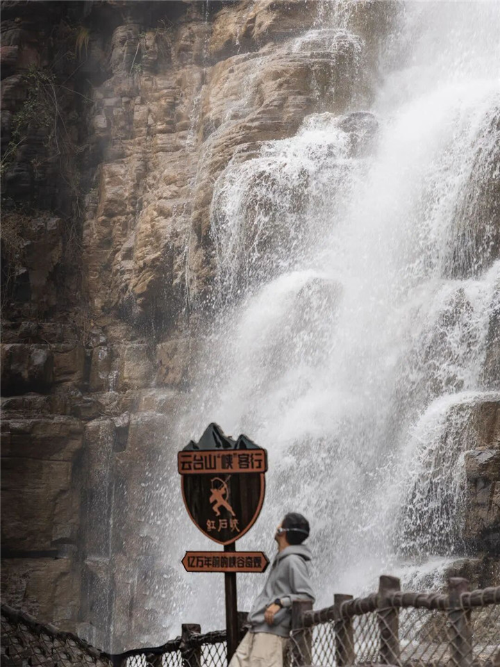 珠帘壁挂——泉水从崖顶细密垂落,阳光下折射出七彩光斑,宛如流动的水晶幕帘。