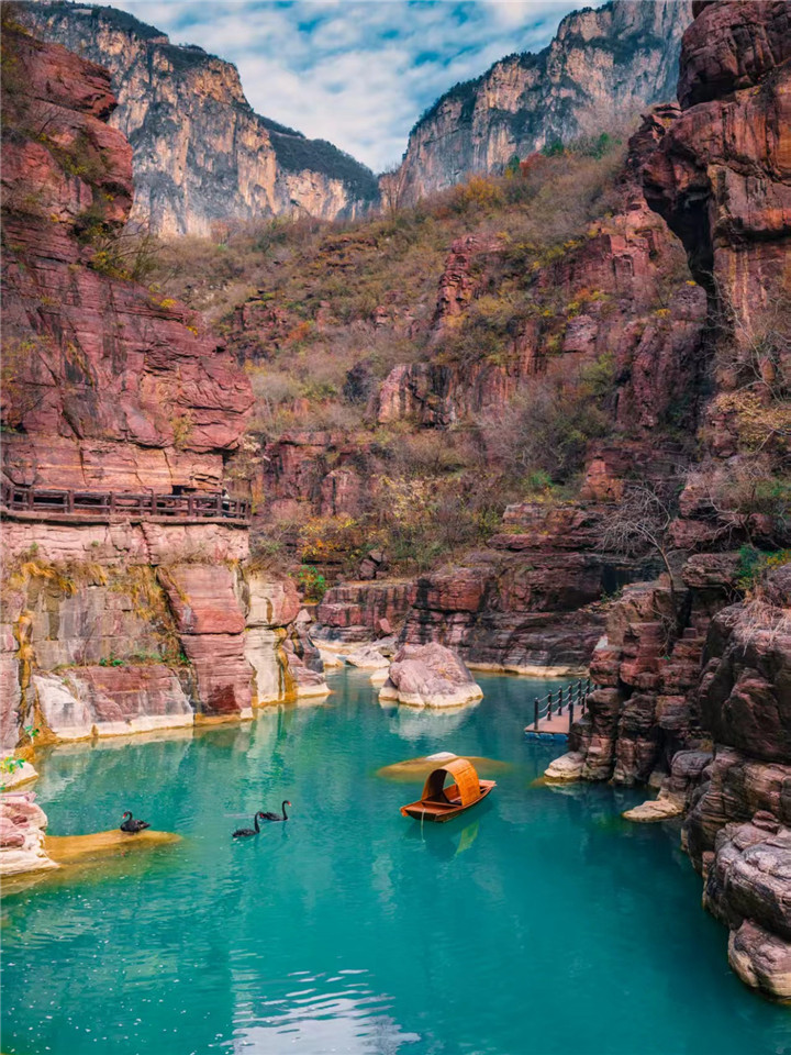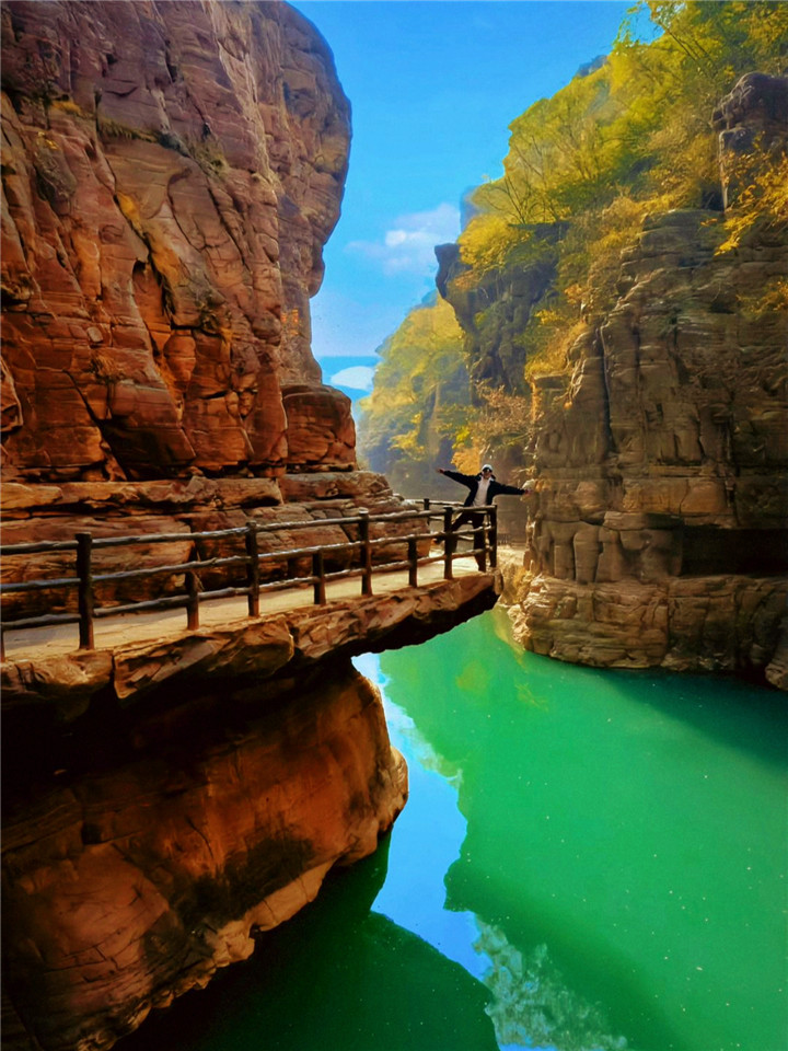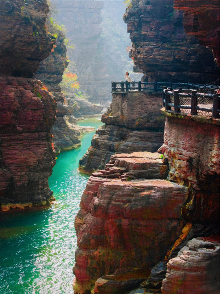 丹霞红崖——铁质矿物染出深浅不一的朱砂色,阳光一照,峡谷艳丽多姿。