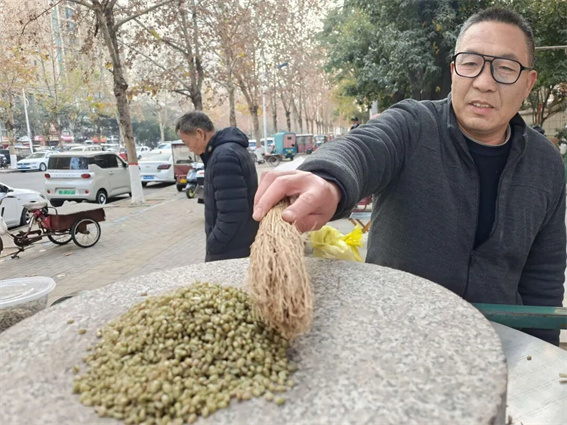 “碾转”,是一种用尚未完全成熟的青麦经脱壳、炒熟、石磨碾制而成的传统食物。银红杰介绍,这门手艺他已做了十多年。早年在青海经营,后来孩子成家,他和妻子回了临颍老家,又在许昌市区梨园转盘附近租了房子,还特意从青海运来青麦冷藏保存,而后骑着电动车、载着石磨,以流动的方式在市区现做现卖。