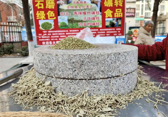 12月8日,许昌市区南海街,一辆三轮车上的石磨缓缓转动,炒熟的麦仁经过石磨的碾压,一缕缕长短不一的条状碎粒从石磨缝隙中缓缓落下,引来不少路人驻足。来自漯河市临颍县的银红杰和妻子赵丽芬正现场制作一道渐被遗忘的传统美食——“碾转”。这一幕,仿佛时光回溯,勾起了许多中年人乃至白发老者的旧日记忆。