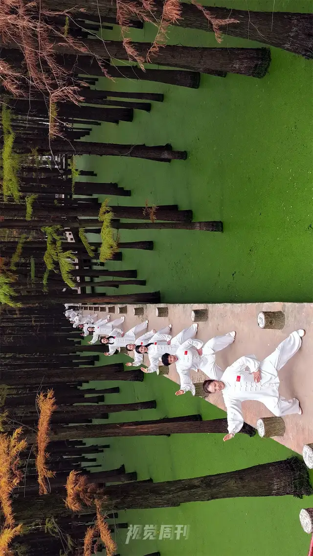 新蔡县北湖公园的水杉林间,太极拳爱好者衣袂翩跹,动作行云流水,在红棕林影中演绎武术韵味。