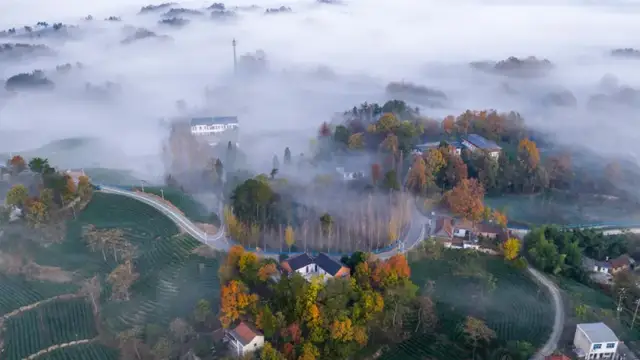 信阳市浉河区的茶园,晨雾如纱漫过茶垄,经霜的乌桕树燃着赭红与明黄,与黛绿茶丛绘出“秋未远、冬已临”的图景。