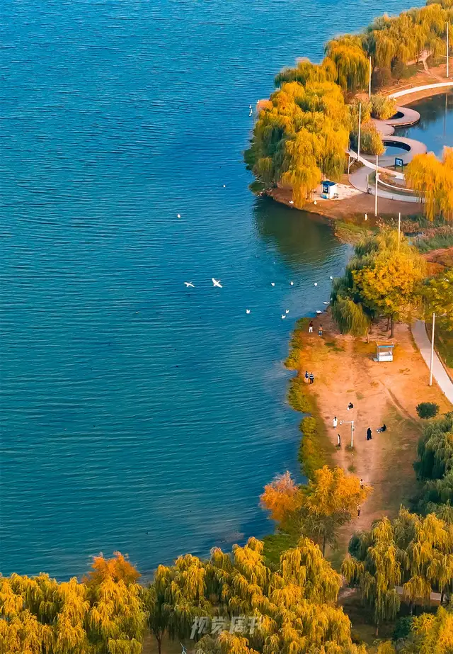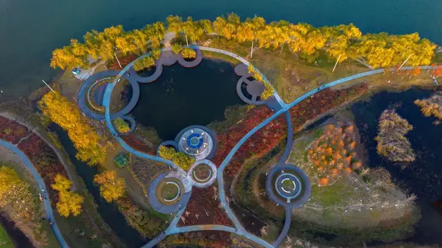 郑州龙湖湿地公园,水波荡漾,金黄树影与蜿蜒栈道绘就生态画卷,飞鸟游人共赏静谧。
