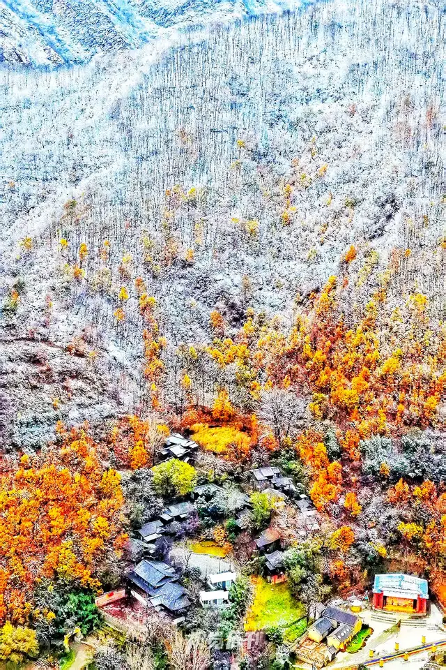 禹州市鸠山镇大鸿寨上演“半山彩林半山雪”的奇观,秋的绚烂与冬的静谧完美交融。