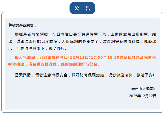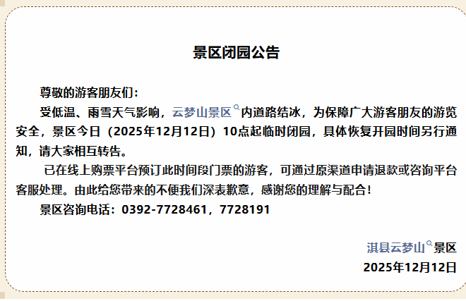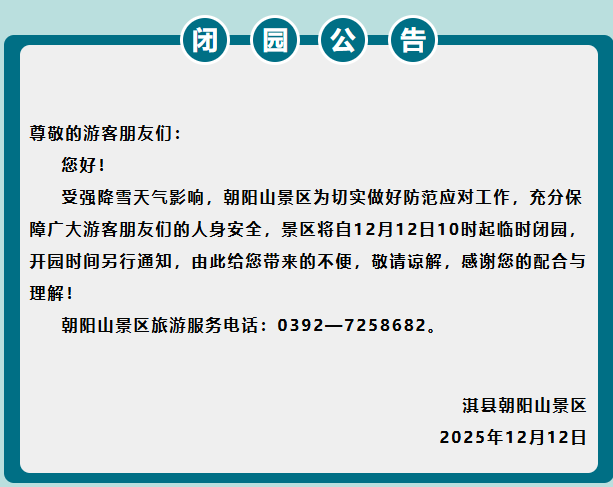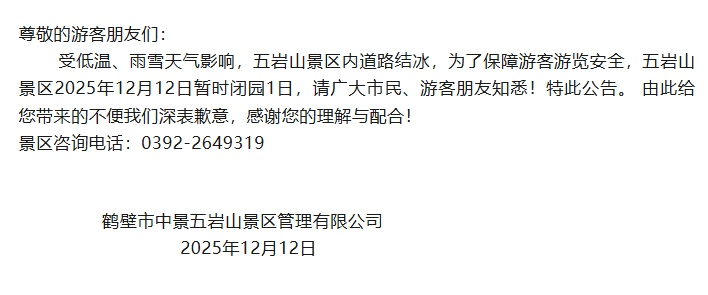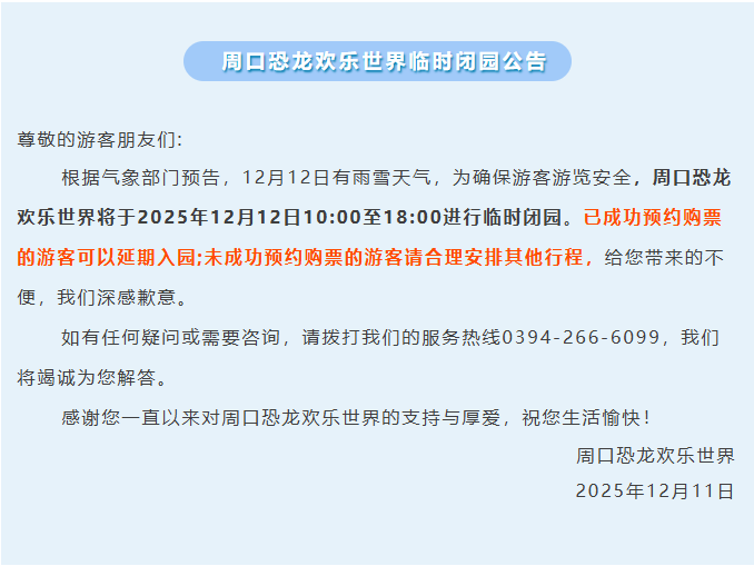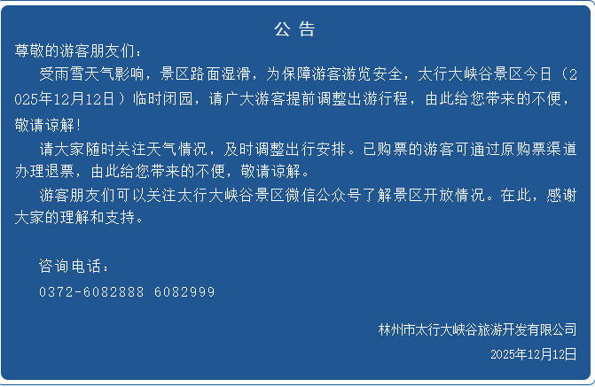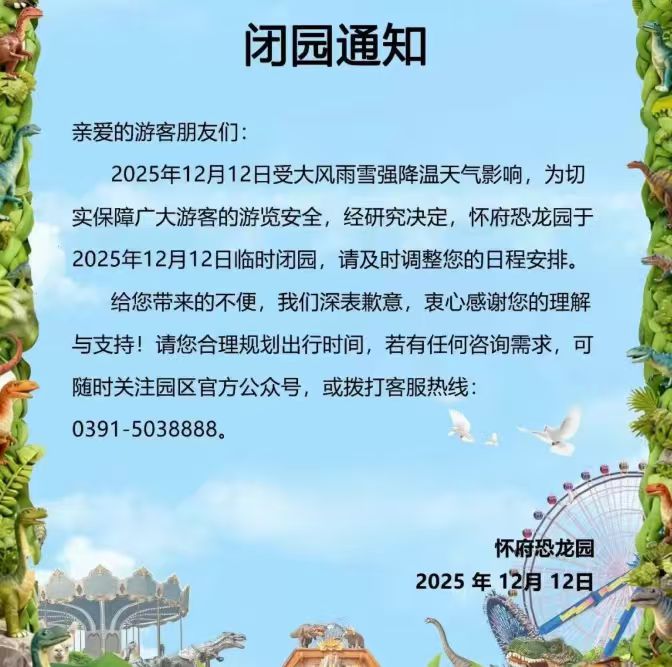 12月12日,记者从郑州索河郊野公园、太行大峡谷、周口恐龙欢乐世界等景区获悉,受降雪天气影响,为充分保障广大游客的人身安全,各景区于今日(12月12日)临时闭园。