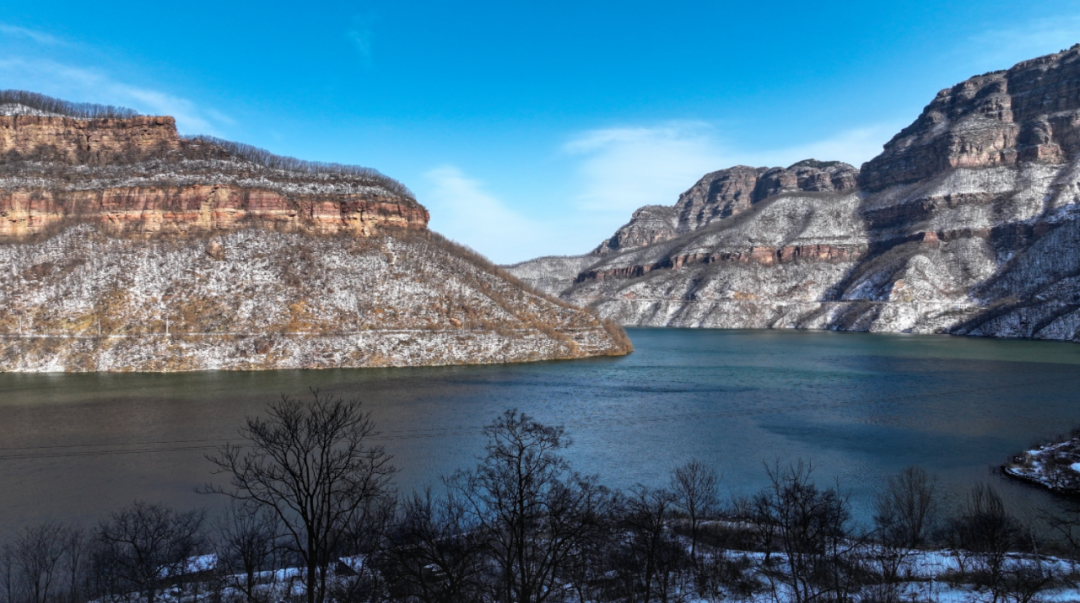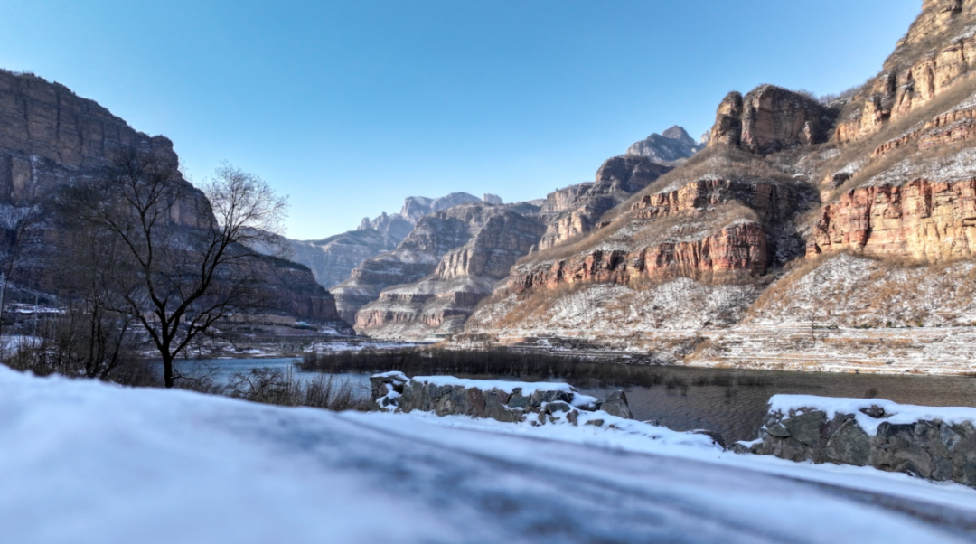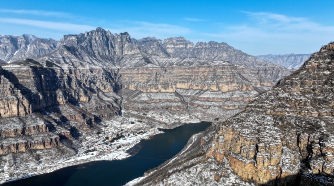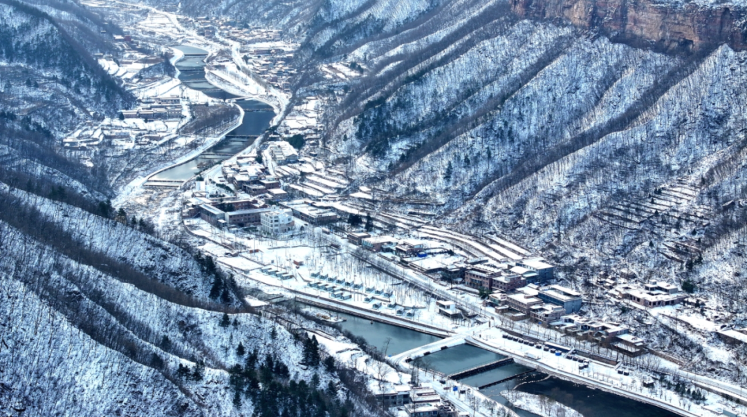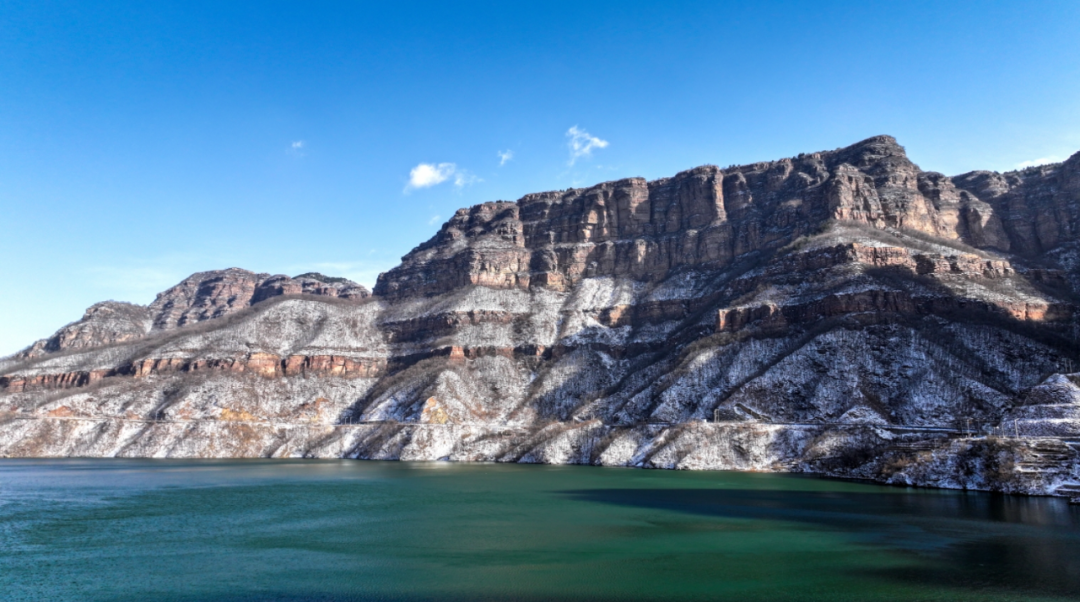 受冷空气影响,林州太行大峡谷迎来今冬初雪。次日天晴,暖阳遍洒,太行大峡谷银装素裹,分外妖娆。放眼望去,白雪覆盖峰峦,红色石英砂岩与素雪相映,勾勒出雄浑轮廓;山间道路积雪铺就,沿线村落炊烟袅袅,石板房脊顶雪层如棉。澄澈湖水如翡翠流转,湖岸冰雪晶莹,碧水与雪山交相辉映;岸边林木凝霜挂雪,玉树琼枝间,山、雪、水、村相融一体,绘就一幅静谧雄奇的冬日画卷,美不胜收。