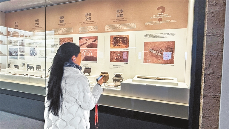 12月17日,游客在郑州商都遗址博物院参观时,使用AI讲解设备了解文物与展区信息。 本报记者 黄岱昕 摄