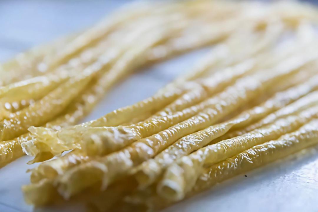 同样是开封的特色,陈留豆腐棍则展现了豆腐的另一种形态。这种独特的豆制品以优质大豆和精炼花生油为原料,经过泡豆、磨浆、煮沸后,将表层油皮卷在涂油的高粱秆上制成。