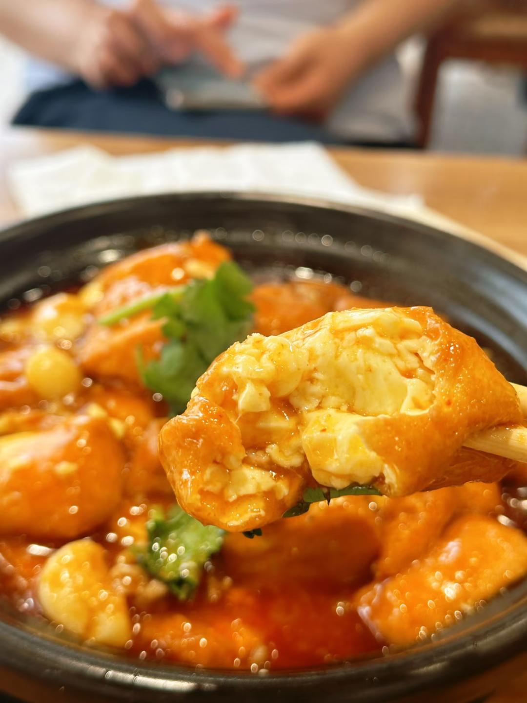 最经典的是大骨汤底。牛骨或猪骨熬得奶白醇厚,鲜嫩的豆腐块如白玉沉浮,喝的是一口浓郁的肉香与豆香的交融,豪迈带劲。