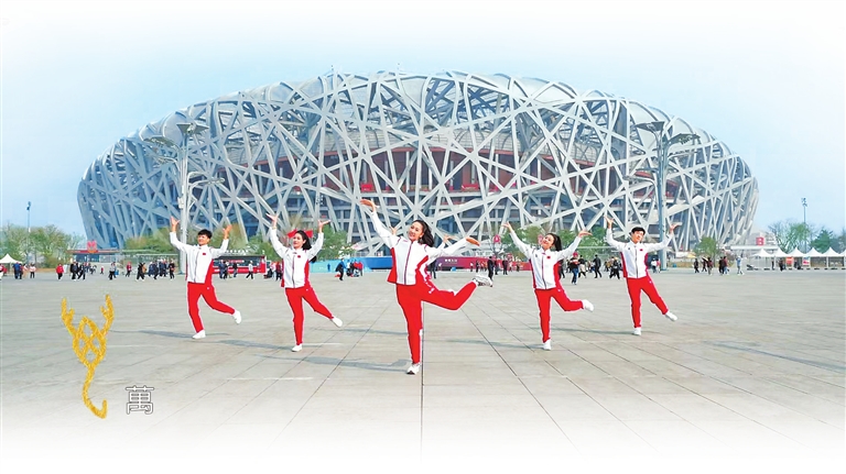 艺术体操世界冠军隋剑爽(中)为甲骨文广播体操宣传代言。图中在表演甲骨文“萬”字。