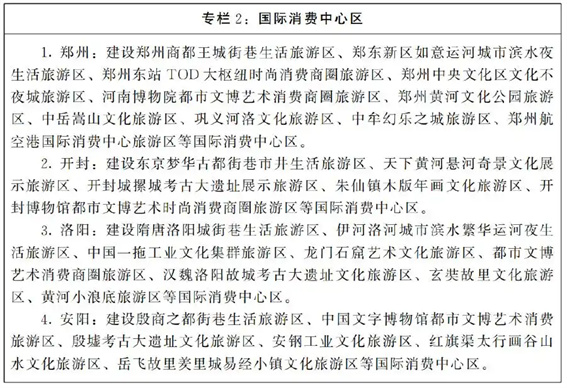 三、品牌支撑。郑州定位“天地之中、功夫之都”,开封定位“悬河古都、东京梦华”,洛阳定位“千年古都、牡丹花城”,安阳定位“中国字都、殷商胜地”,着力建设一批具有代表性的国际消费中心区。