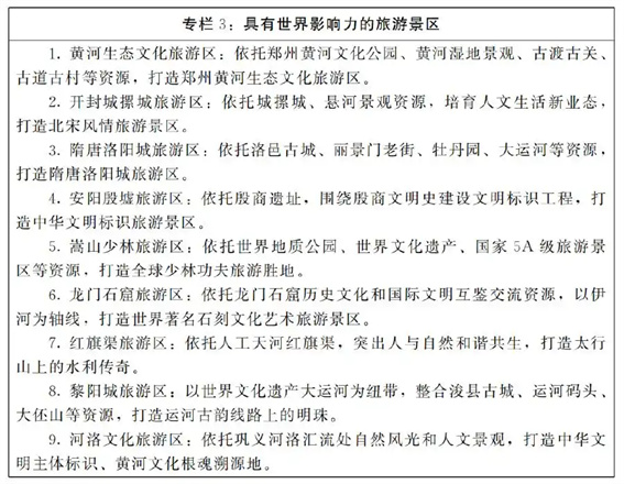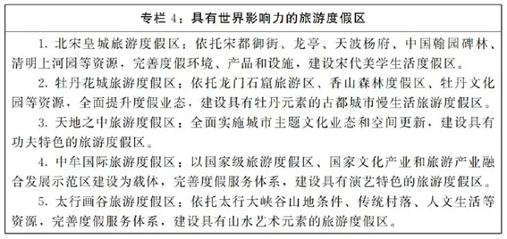 一、建设具有世界影响力的旅游景区和度假区。依托世界遗产、国家5A级旅游景区和特品级旅游资源,高标准建设一批具有黄河魂、古都韵、中国情的旅游景区和度假区。