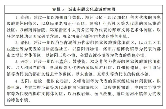 1.郑州:打造以少林寺、塔沟武校等为代表的功夫体验游线路,以河南博物院、郑州商代都城遗址博物院、塔湾古街等为代表的历史记忆游线路,以郑州记忆·1952油化厂、郑州第二砂轮厂旧址等为代表的工业文化游线路,以郑州黄河风景名胜区、巩义河洛汇流处等为代表的黄河风光游线路。