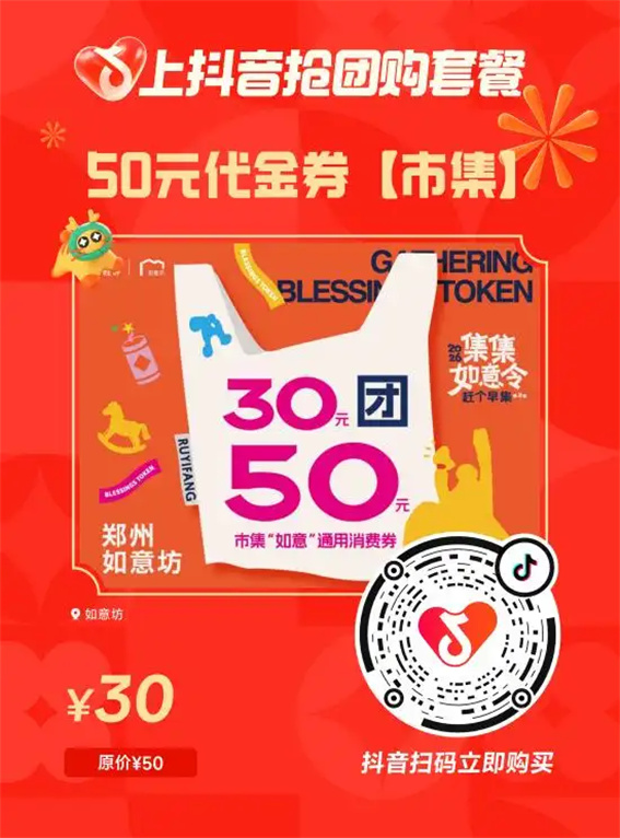 线上预购:抖音平台即将上线“30元团50元”市集专用“如意”消费券!提前锁定,现场消费直接抵用,相当于全场6折起步。