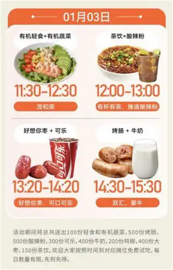 逛累了?双汇、好想你、豫道酸辣粉、蒙牛、可口可乐、有杯有茶、茂和荣、坚芽乐坚果等知名品牌将在特定时段提供免费试吃,打造舌尖上的惊喜时刻,具体时段请留意现场公告。