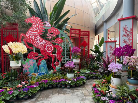 花展设置“马上有福”“马到成功”“龙马精神”“天马行空”“马踏祥云”及“花卉展示区”六大主题展区,紧扣生肖元素,融入地域文化与沉浸式体验。据悉,本次共展示马蹄莲、蝴蝶兰、石斛兰、秋海棠等“马”年特色花卉及年宵花卉60余种,展出花卉规模可达数千株。