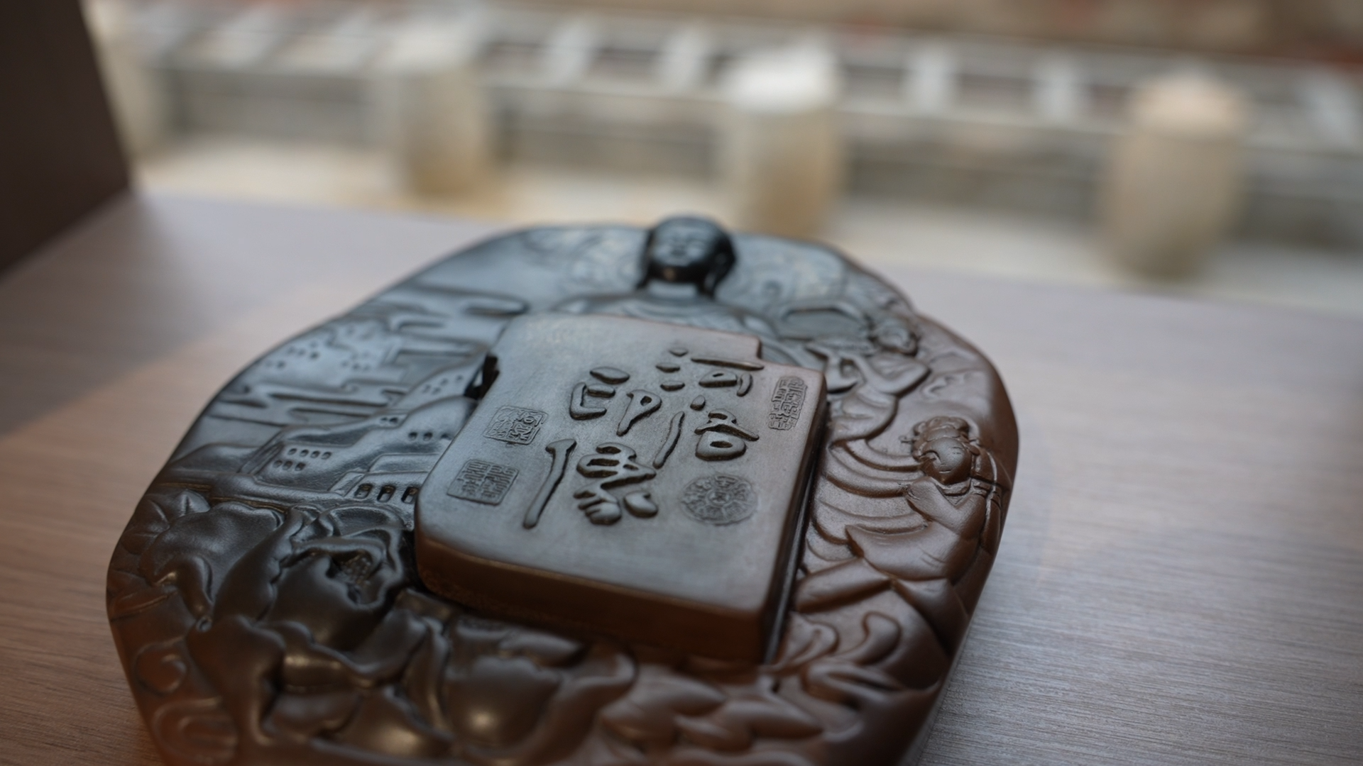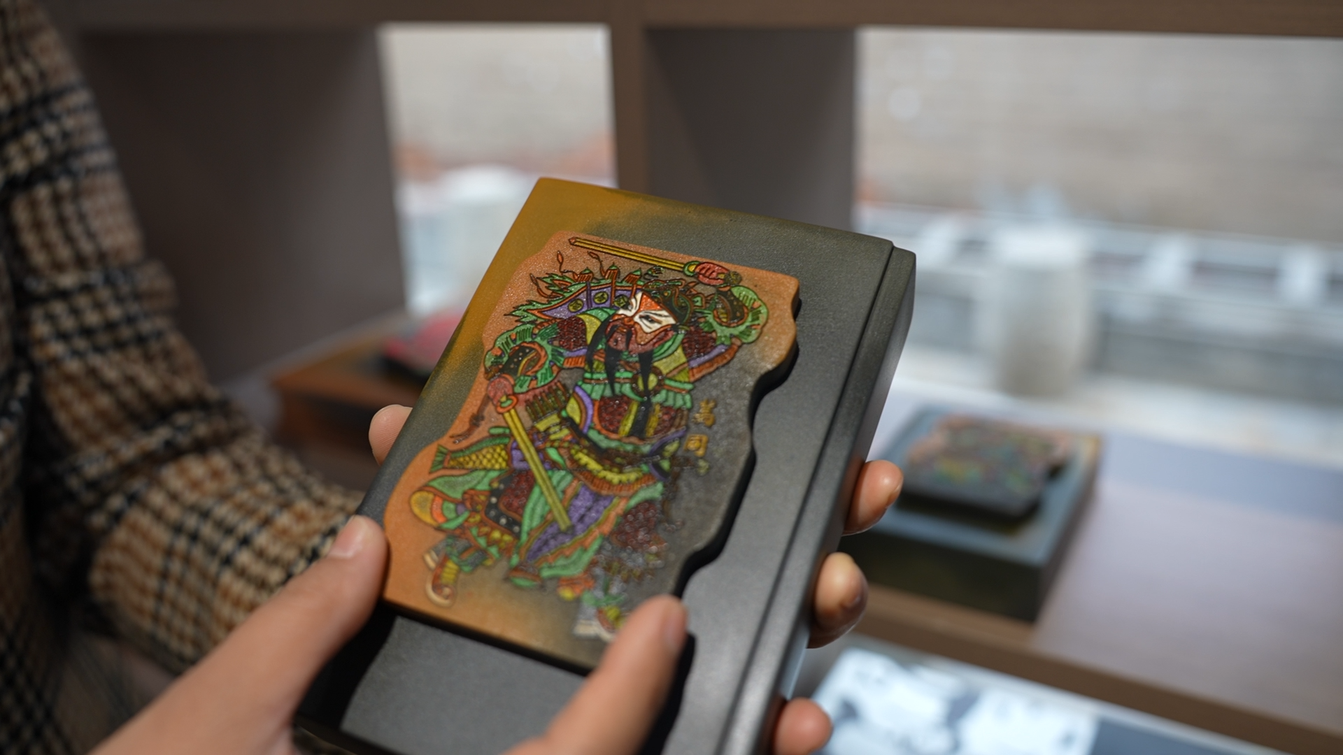 在千唐志斋文创展馆里,多件兼具河洛文化特征与实用性的澄泥砚作品,让人驻足流连。最引人注目的是一对《老家河南》砚,砚盖采用朱仙镇木版年画中的门神元素,色彩鲜亮,栩栩如生。“木版年画也是河南的非遗,我们把两种非遗结合起来。”游晓晓轻轻打开砚盖,“这对砚既像老家的两扇木门,又像上下五千年的两卷书。”她指着砚台边缘,“河南有句宣传语‘行走河南,读懂中国’,我们希望大家透过这‘两扇门’,这对砚,让它在既保留了砚的实用功能的前提下,又如一把钥匙,能打开一扇通往老家记忆和中原文化的大门。