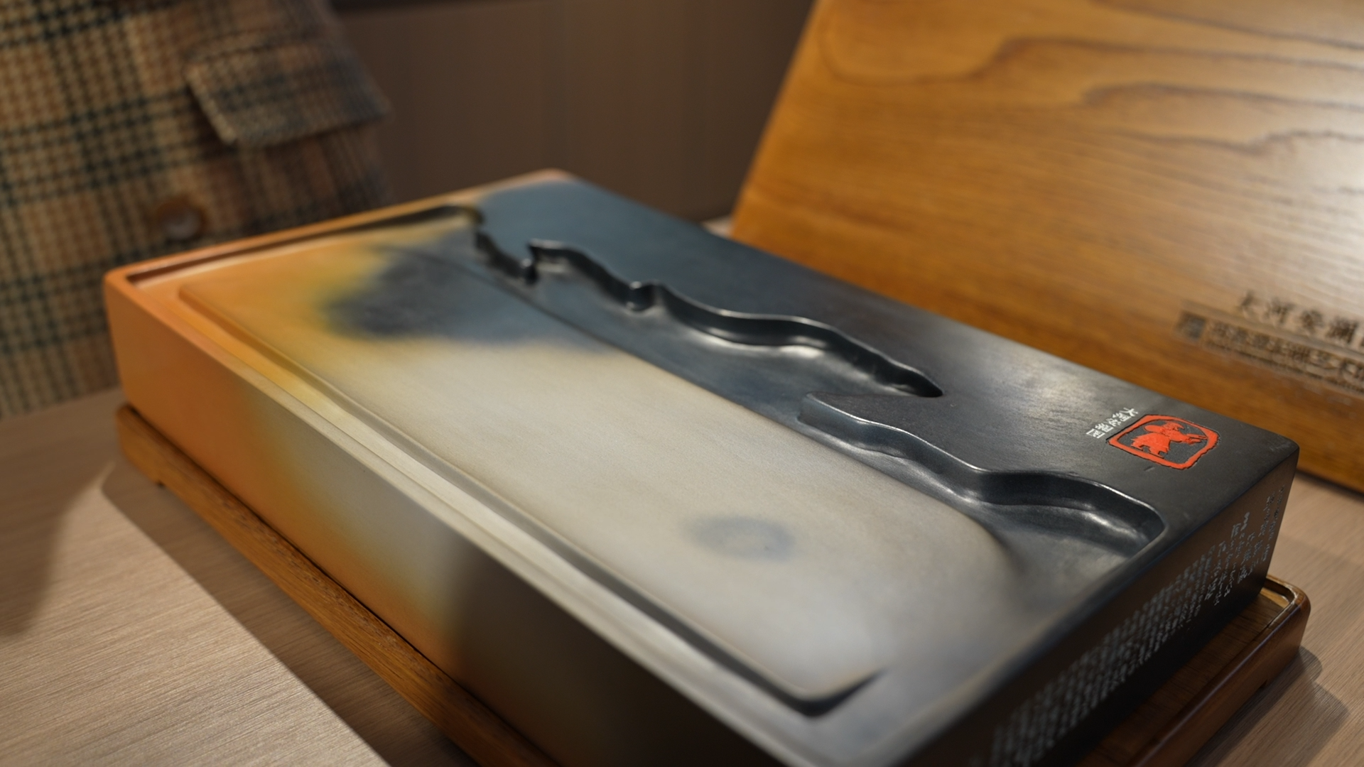 而另一方《大河安澜》砚同样令人称奇,整体以黄河河形为砚池,主线凸显大河雄风,砚壁四周则刻满历代治黄功臣的名字。“黄河是母亲河,河畅则民康。”游晓晓抚摸着砚上的文字,“我们想通过这方砚,让大家记住治黄功臣的丰功伟绩,感受大河安澜下的盛世华章。”这方砚在非遗技艺与文化赋能里,将砚台超越文房用具之形,让器物承载民族精神之光。
