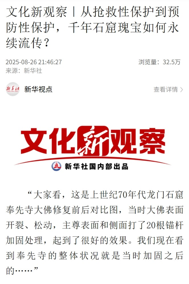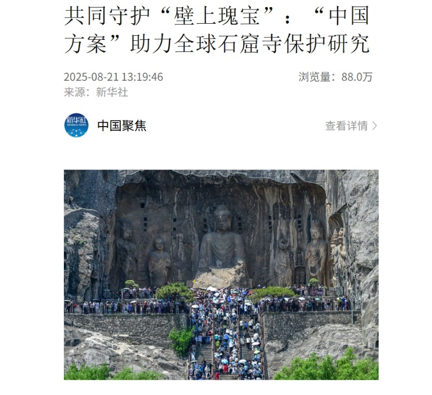 新华社推出多篇重磅报道,其中《智绘中国・世遗镜鉴|数字技术让龙门石窟“芳华永驻”》深度揭秘石窟数字化保护成果,通过超精建模、数字复位等技术手段,让千年纹饰实现“数字永生”;《共同守护“壁上瑰宝”:“中国方案” 助力全球石窟寺保护研究》则聚焦2025石窟寺保护国际论坛,向世界传递中国石窟保护的先进经验。