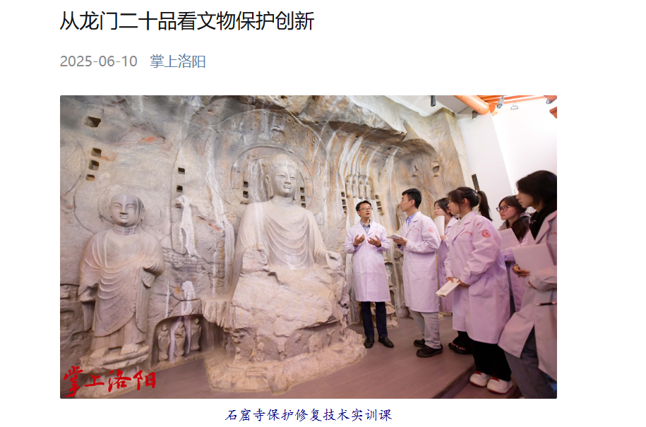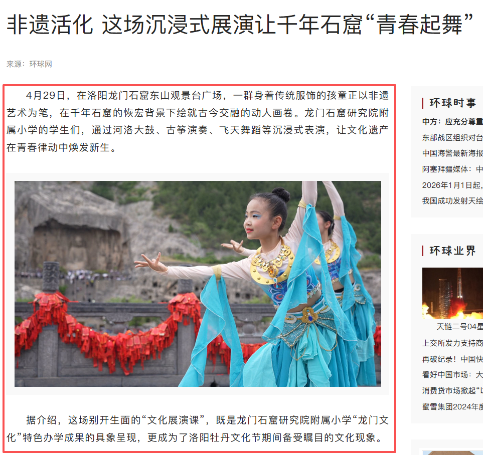 此外,央视新闻与中国日报等主流媒体也持续为龙门石窟的传播赋能,如央视新闻《习近平河南行|干龛邻峭壁瑰宝绽芳华一走进龙门石窟》一文中,以生动的图文和视频记录,展现石窟的千年气象与保护现状;中国日报英文报道《Experts share extensive methods in conservation of cave temples》,以国际语言向全球推介龙门石窟的文化价值与保护实践;环球网《非遗活化 这场沉浸式展演让千年石窟 “青春起舞”》报道附属小学沉浸式展演,展现文化传承的创新形式;中国旅游报《守护文化瑰宝 擦亮自然珍宝》结合 “文化和自然遗产日”,深度分析龙门石窟文旅融合的发展路径。