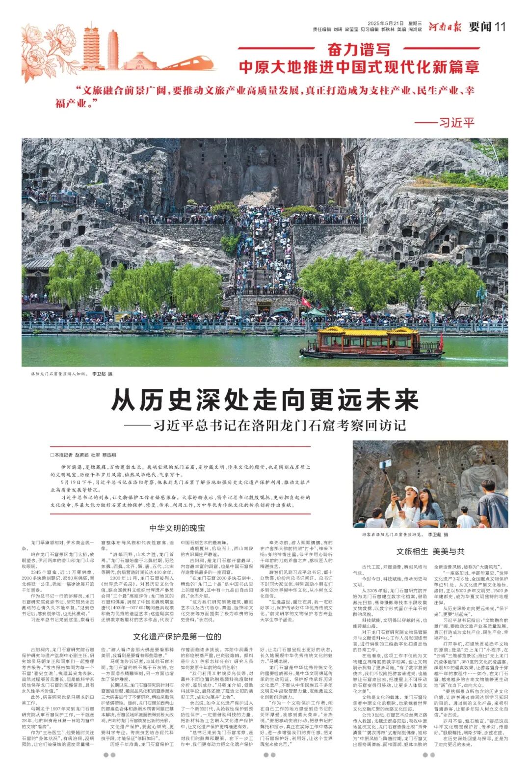 作为河南文化的 “金名片”,龙门石窟在省级媒体平台同样热度不减。河南日报通过多角度、多形式的系列报道,全面展现了龙门石窟深厚的文化内涵与时代价值。例如,《潜心护瑰宝 龙门韵传扬——习近平总书记在龙门石窟考察回访记》一文,通过一线工作人员口述,还原考察现场的动人细节。