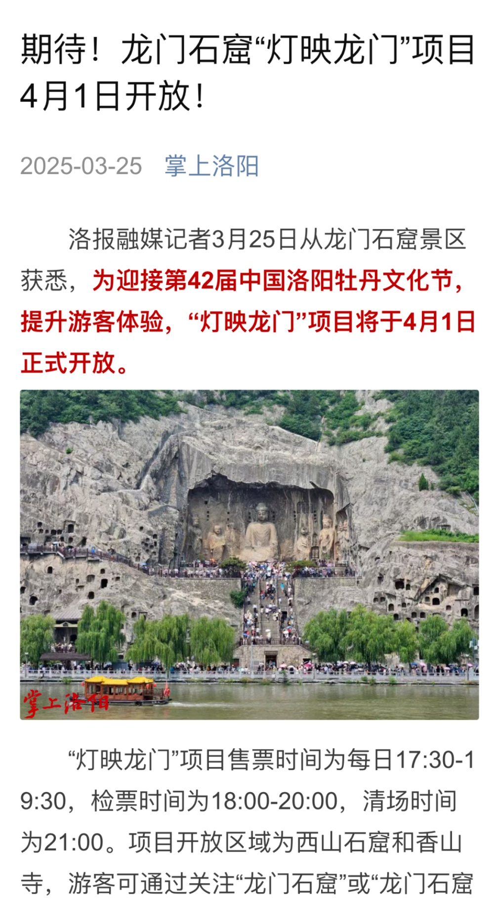 掌上洛阳客户端紧扣大众视角,生动呈现龙门石窟的服务创新与文旅体验。例如,《期待!龙门石窟“灯映龙门”项目4月1日开放!》第一时间推送夜游新动态,让市民与游客实时感知光影赋予千年石窟的崭新魅力。