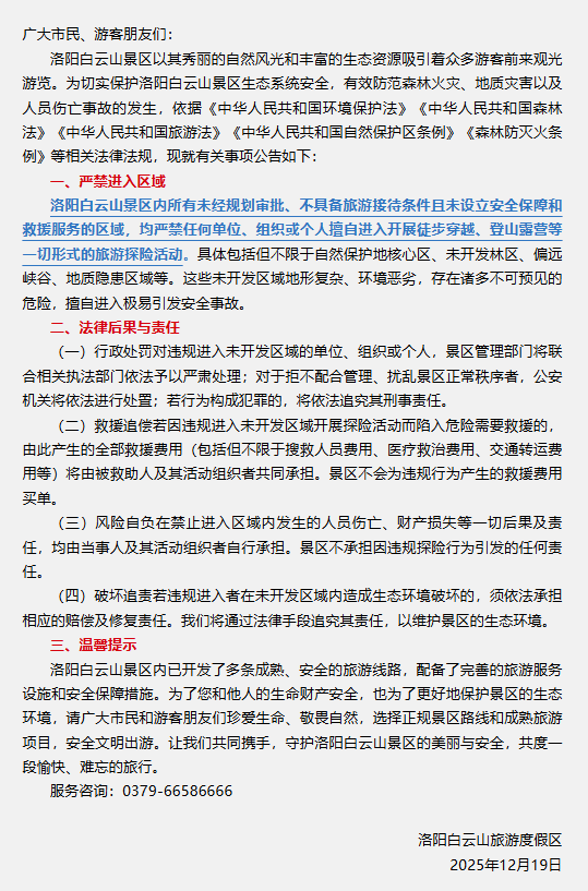 关于禁止在洛阳白云山景区未开发区域开展旅游探险(徒步穿越)等活动的通告