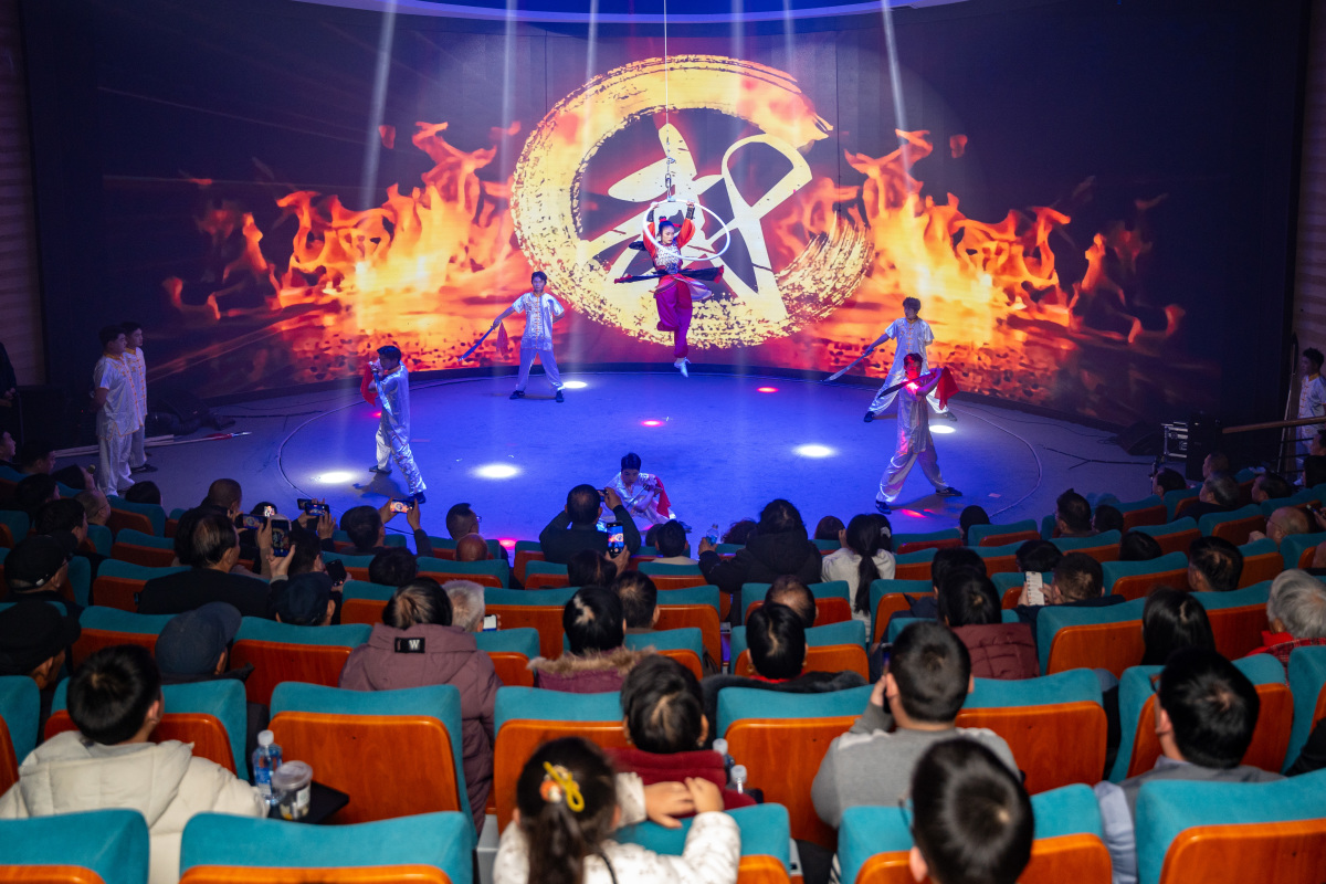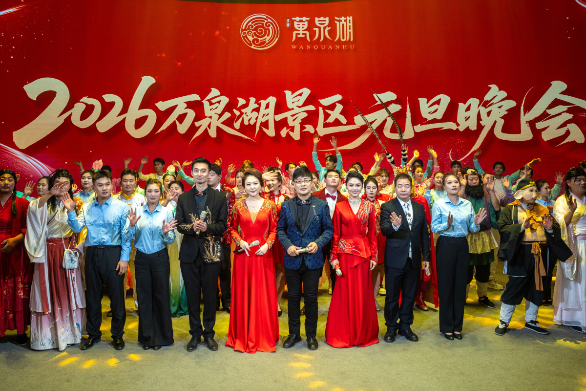 午后,以“逐光同行”为主题的元旦晚会拉开序幕。四大篇章层层递进、环环相扣,为观众带来视听与心灵的双重浸润。在“岁月回响·温情满溢”篇章中,男声独唱《欢聚一堂》、诙谐双簧《纣王与妲己》、喜庆舞蹈《你好我好·新年好》相继上演,团圆祥和的氛围漫染全场;“同心筑梦·砥砺前行”篇章里,武术《钢铁意志·万泉湖》气势磅礴,舞蹈《幸福中国一起走》昂扬向上,诗朗诵《万泉魂·家国情》字字铿锵,诠释出景区人团结奋进的精神内核;“家园情深·归心似箭”篇章将晚会推向高潮!雄浑豪迈繁荣《向天再借五百年》,引发现场共鸣,情景表演剧《回家》以质朴演绎叩击人心;拉丁舞《万泉湖上的华尔兹》为冬日增添浪漫注脚;最后,在“逐光同行·共赴新程”的篇章中,管乐队演奏、歌伴舞《我把故乡比苏杭》及小品《西游记外传》带来了别样视听享受。全场齐唱《相亲相爱》,唯美旋律萦绕湖畔,定格同心筑梦的动人瞬间。