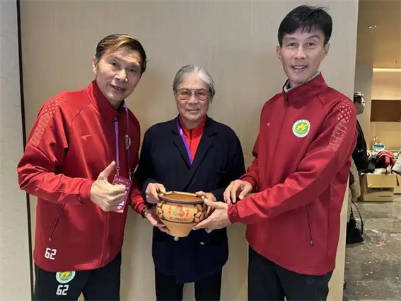 2026年1月3日,第44届“省港杯”足球赛(第二回合)在广州南沙大湾区文体中心体育场举行。活动现场,一场特殊的文化交流引人注目——三门峡市非物质文化遗产代表性传承人王新军委托参加省港杯元老赛的前国家足球队队长池华明、区楚良,向莅临观赛的中国香港体育协会暨奥林匹克委员会会长、亚奥理事会第一副主席霍震霆,赠送“全运花开”仰韶彩陶盆,以此表达对霍氏家族的由衷敬意,感谢其为祖国体育事业及足球发展作出的重要贡献。中国香港足球协会主席霍启山一同见证了这一时刻。