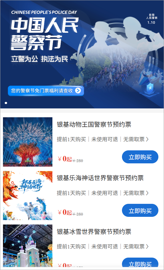 记者从银基国际旅游度假区了解到,1月10日,在第六个中国人民警察节来临之际,郑州银基国际旅游度假区将推出对人民警察的专属免票优惠:1月10日当天凭本人身份证及人民警察证,可免费游玩银基动物王国、银基冰雪世界、银基乐海神话世界、银基黄帝宫御温泉四大园区,一名成人还可携带一名1.1米以下的儿童入园。