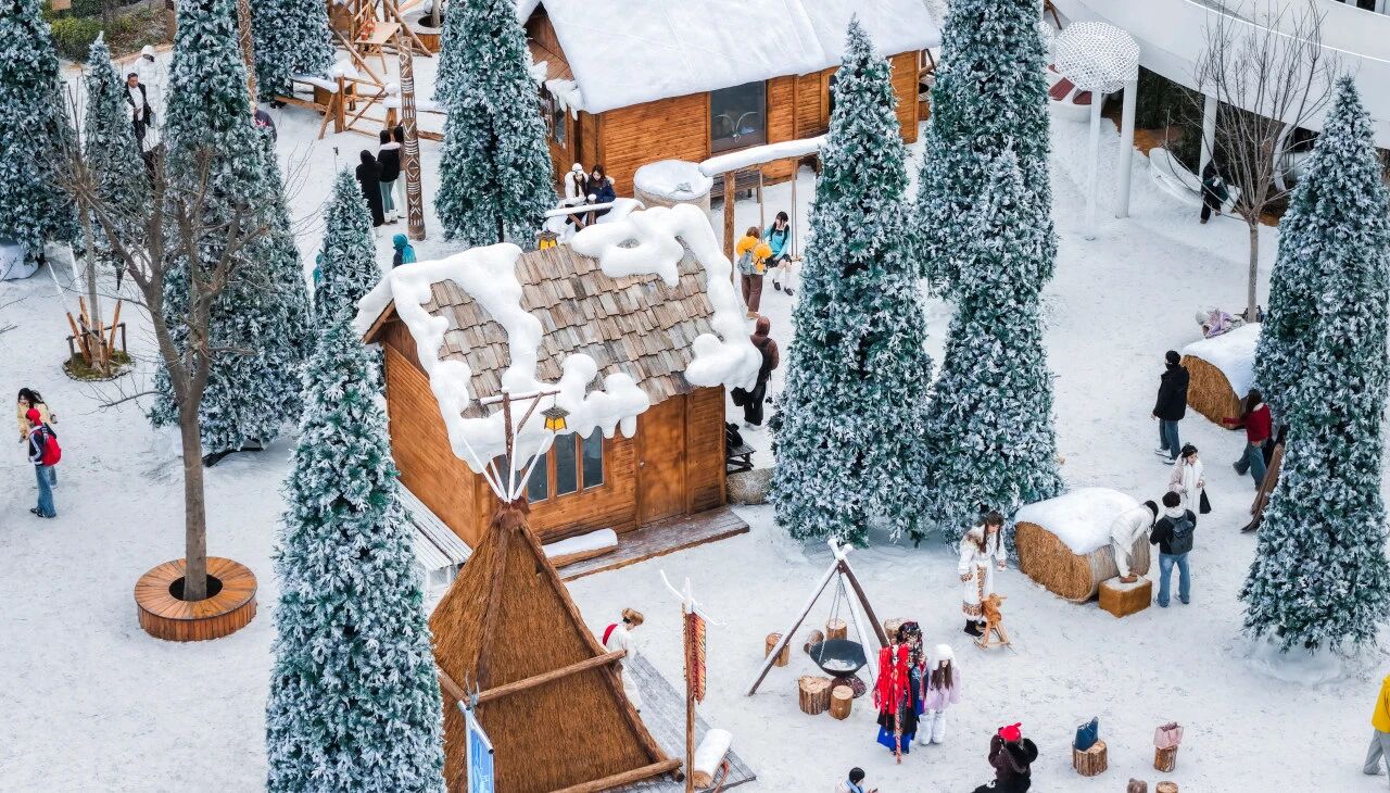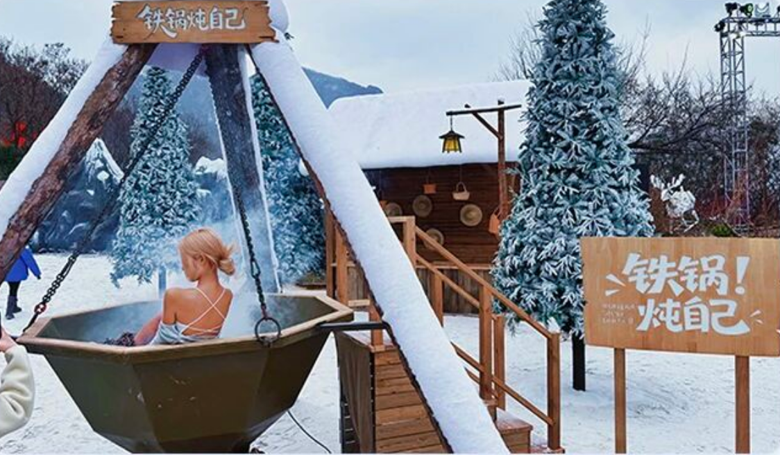 宝泉的悬崖之上,有一座“玫瑰雪山”,山下的火山温泉飘着仙气,再配上旁边的“铁锅炖自己”,简直就是“冰火两重天”的极致体验;同时,景区还引入“阿勒泰雪屋”设计,原木木屋盖着厚雪被,游客可在此休憩、拍摄雪景大片,还有冰族王子、狼女、圣女等 NPC 在线陪拍,以及各种小动物在线互动打卡。