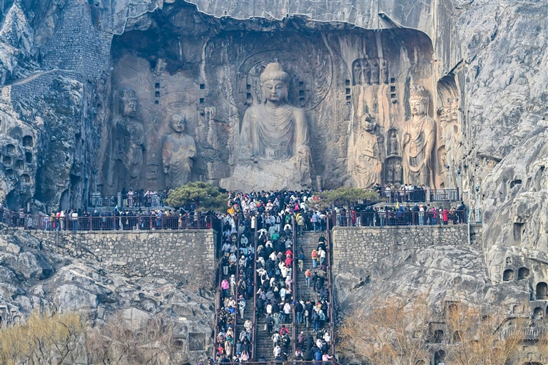 1月4日上午,朔风凛冽,洛阳龙门石窟景区依然游人如织、热度不减。