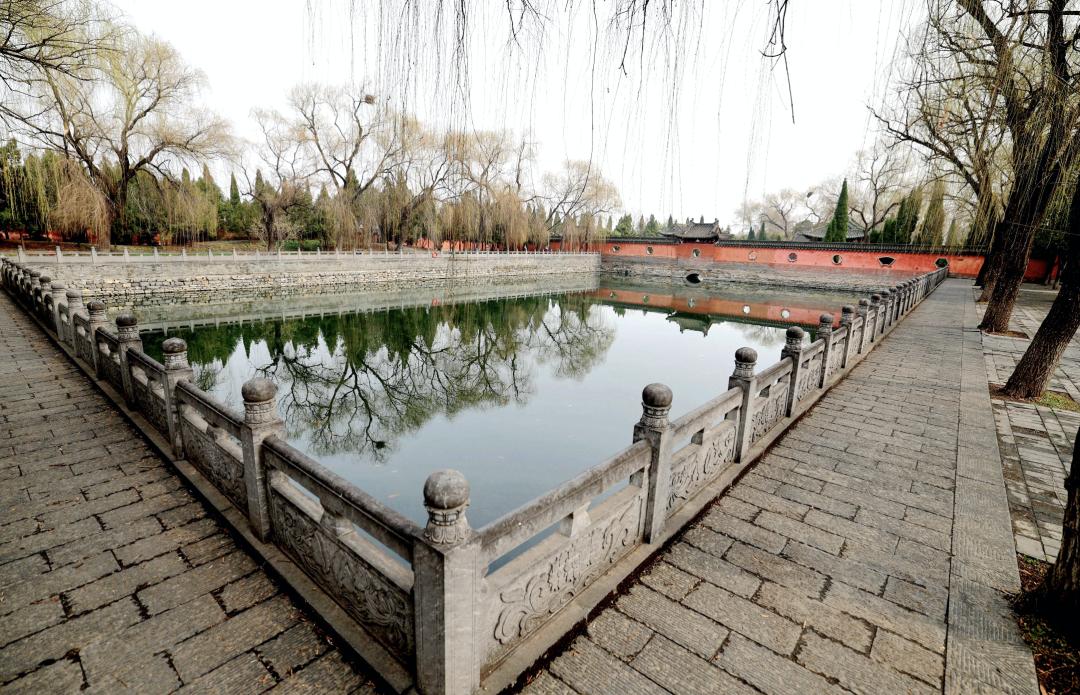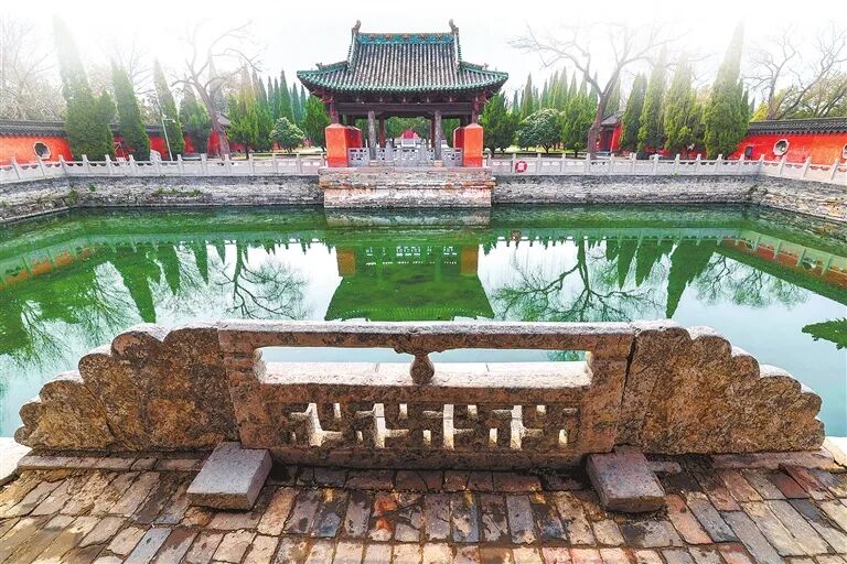 站在龙亭北侧,济水之源尽收眼底。隔着清澈的龙池,对面是小巧的灵源阁,构造简明,为明代早期建筑。孙丽娟提醒记者注意阁前的石栏杆:“那是中国目前唯一且保存完整的宋代单勾栏实物,其造型、花纹与《营造法式》记载相符。”