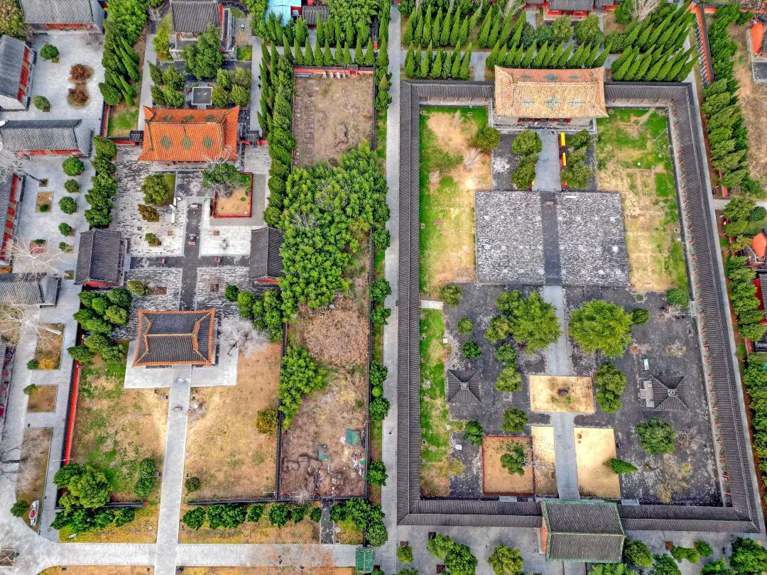 鸟瞰渊德大殿遗址。渊德大殿原来是济渎庙的核心建筑,清代毁于战火,基址尚存,巨大的柱础石排列齐整