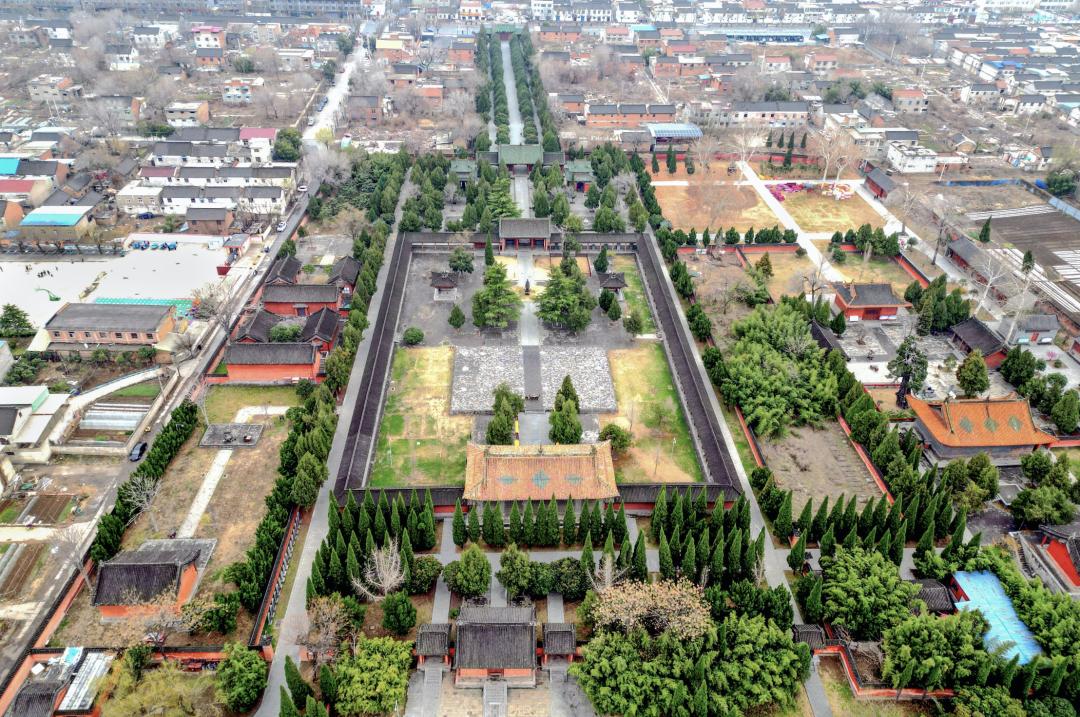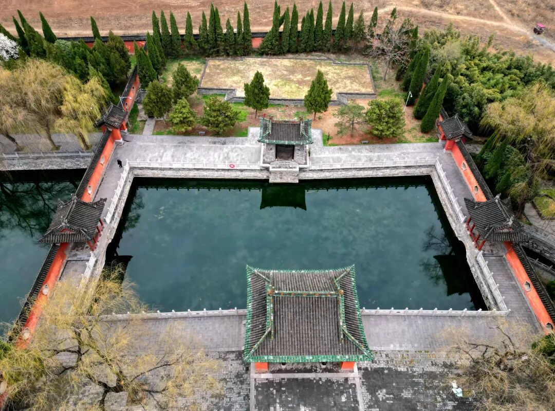 济源示范区文物保护研究中心工作人员刘洪建说,济渎庙布局呈“甲”字形,前方后圆,体现了古人“天圆地方”的宇宙观。俯瞰济渎庙,建筑群加上周边的河流、池塘,呈“金龟探海”之势。