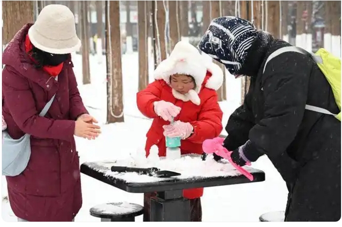 雪毯上骤然跃起鲜活的色彩。二三个孩童裹成绒球,攥着雪球追逐嬉闹,笑声撞碎在冷空气中。一个小女孩拿着煤球雪夹,认真地制作白色煤球,呵出的白气氤氲了冻红的笑靥。