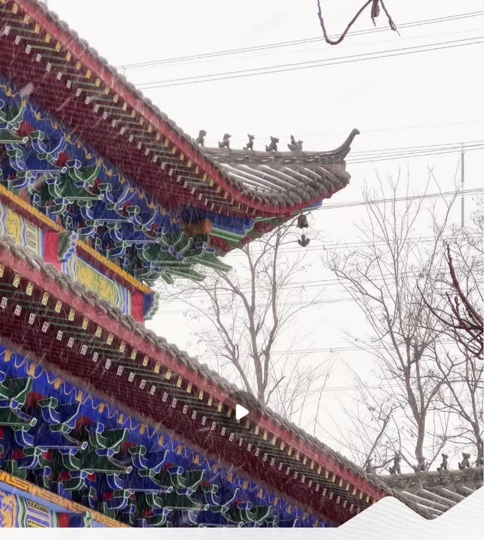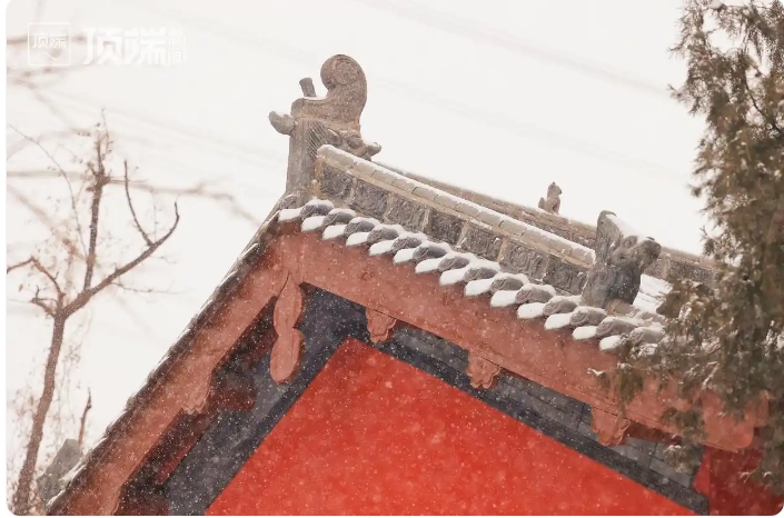 视频中,雪花簌簌飘落,檐铃声时而清脆时而低沉,仿佛为这幅冬景配上了专属背景音乐,这简直就是大自然给古寺安装的沉浸式音效系统。
