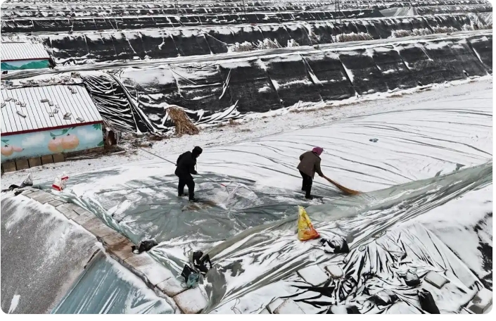 上图:2026年1月19日,山东省滨州市滨城区杨柳雪镇的农民在清理玉米囤苫盖上的积雪。(初宝瑞/人民图片)