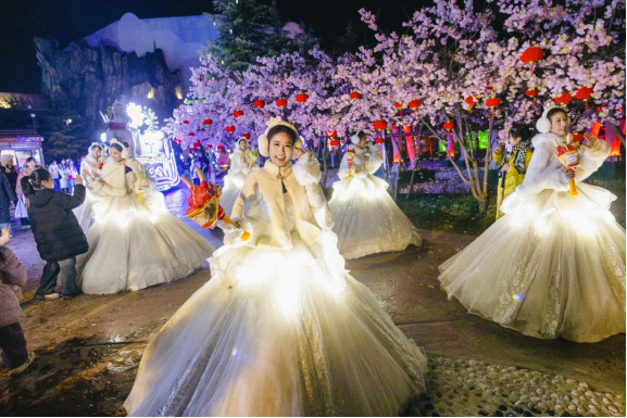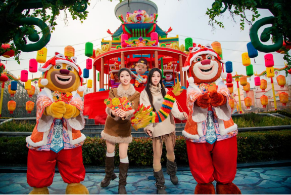 值得期待的是,全新升级的“盛世华章·城堡烟花秀”将在活动期间惊艳亮相,以城堡为背景,用绚烂烟花勾勒出璀璨画卷。同时,高颜值NPC将随机现身乐园各处,与游客互动拜年、合影留念,营造浓厚的节日氛围。此外,潮汕英歌舞、新春乐队演出、狂欢派对及古风市井互动等活动也将轮番登场,为游客带来沉浸式新春体验。