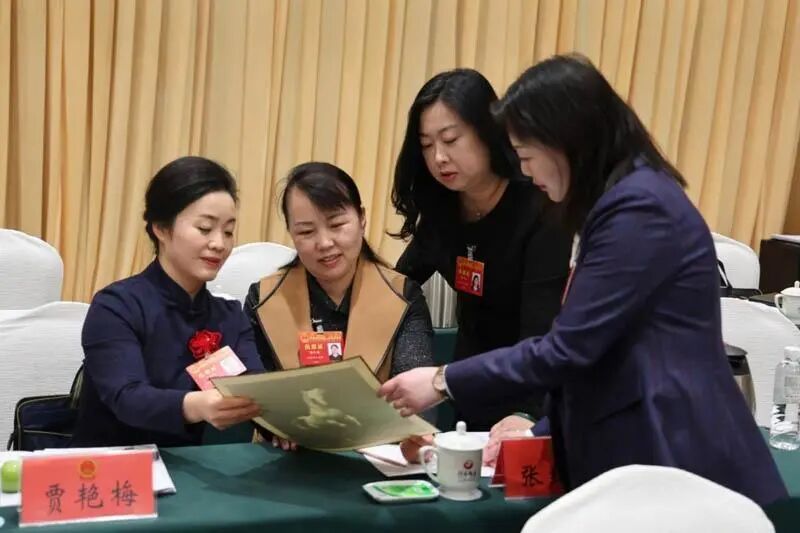 省十四届人大四次会议期间,贾艳梅(左一)向其他代表展示她带来的马年主题剪纸作品。 融媒体记者 屠良冀 摄