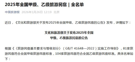 近日,《文化和旅游部关于发布2025年全国甲级、乙级旅游民宿的公告》发布,根据《〈旅游民宿基本要求与等级划分〉(GB/T 41648—2022)实施工作导则》,81家旅游民宿符合全国甲级旅游民宿标准,104家旅游民宿符合全国乙级旅游民宿标准。其中,老城区云华里民宿、栾川县石间民宿获全国甲级旅游民宿,栾川县静语流年民宿获全国乙级旅游民宿。