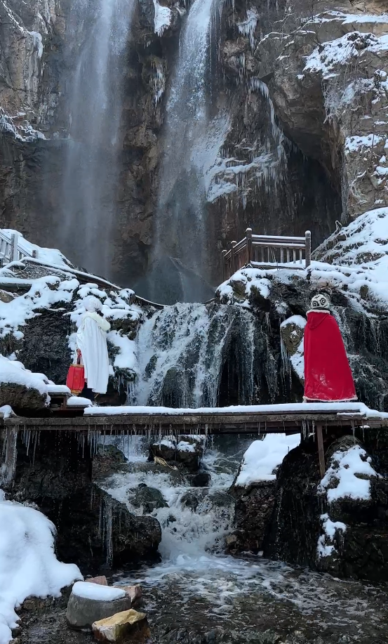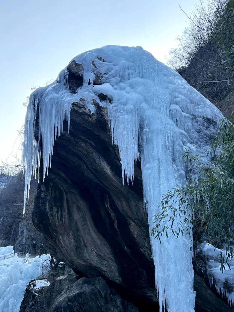 这里是会呼吸的冰雕展!“冰梳”挂在崖壁,连竹枝都裹着雾凇糖霜。听“簌簌”雪落,偶遇冰挂群,恍惚以为误入《冰川时代》片场。潺潺流水和洁白晶莹的冰挂,构成了一幅唯美、宁静的山水画。