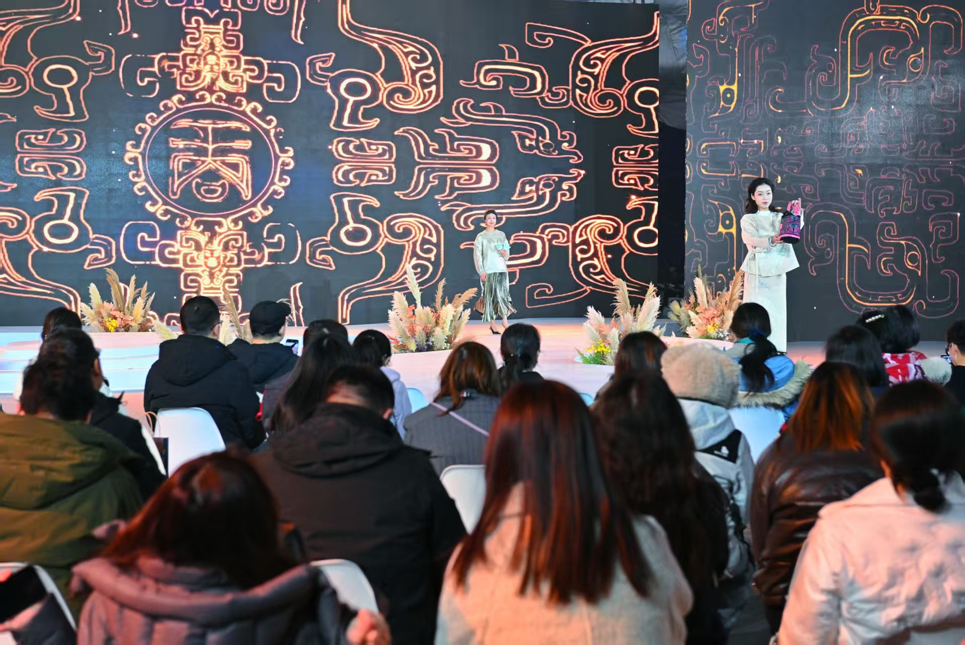 雅集现场,观众席中始终涌动着热烈而专注的氛围。当《神人畅》的鼓声撼动全场时,许多观众屏息凝神;当华服模特身着融合了青铜纹样的现代礼服款款而行时,现场响起阵阵惊叹与快门声;当《商都之光》播放至老考古人工作的黑白影像时,不少观众眼中泛起感动的泪光。