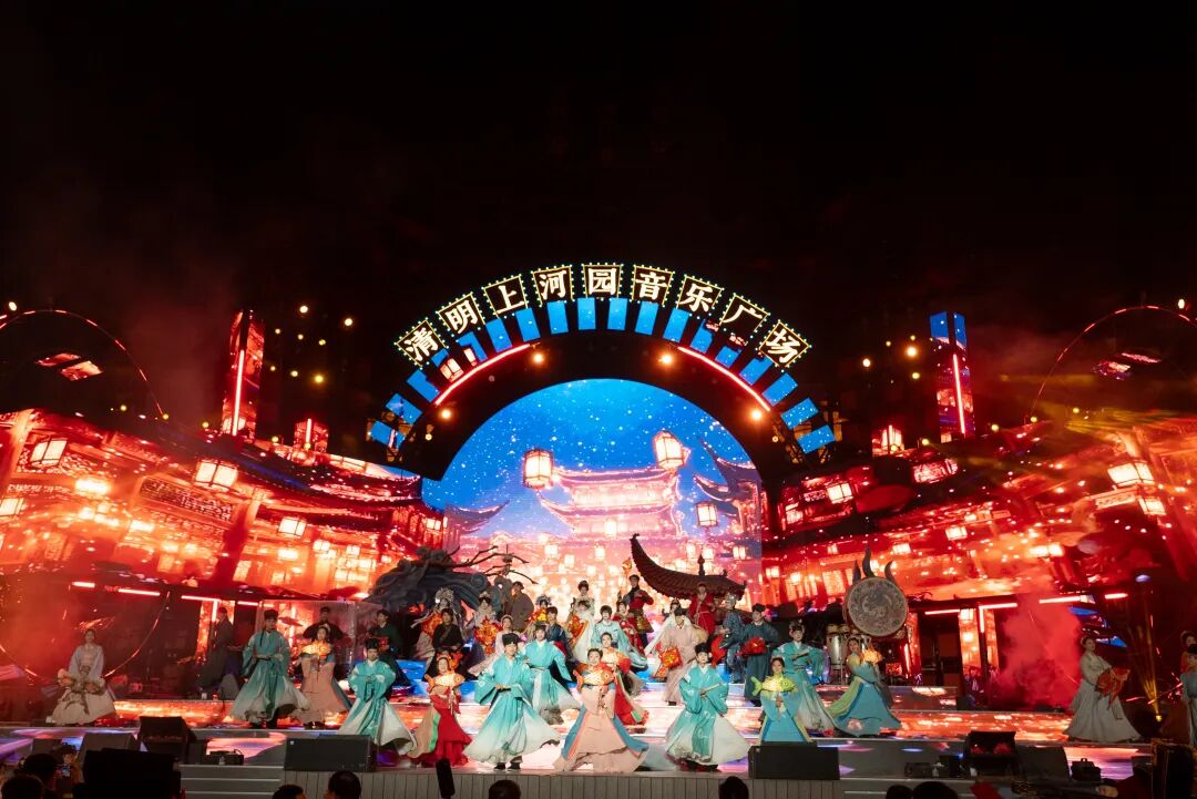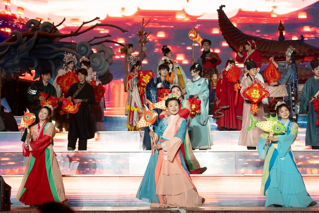启动环节以“华灯”为核心载体,台上巨龙、龙船腾起,台下鱼灯、龙灯次第点亮,沉浸式游园也应声启幕,生动还原了北宋上元夜“凤箫声动,玉壶光转,一夜鱼龙舞”的繁华景象。