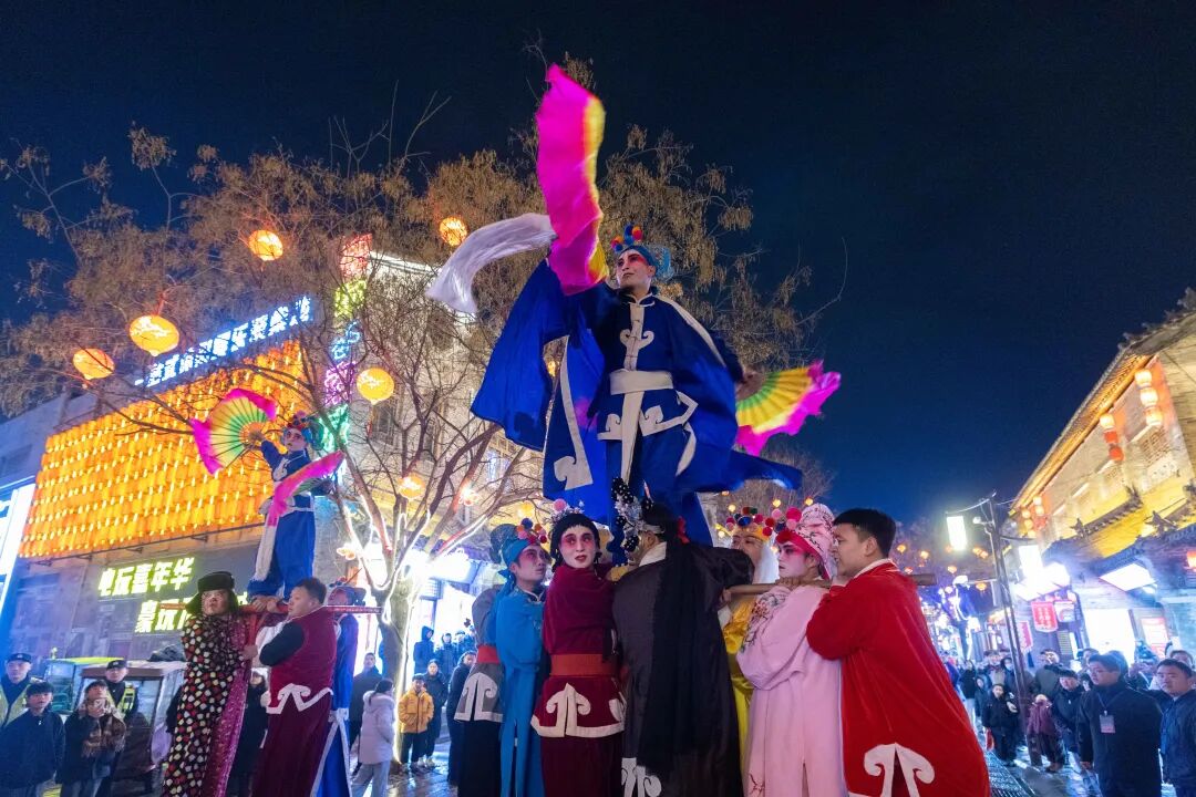 当晚亮相的“社火天团”,令人耳目一新。当传统的门神尉迟恭、秦琼,以及哪吒、雷震子、财神比干等经典形象,遇上了赛博朋克风格的声光电;当古老的高跷技艺,与时尚动感的匹克球运动在街头相遇。这种“最潮”的碰撞,让非遗瞬间变得既古老又摩登,引得现场游客纷纷举起手机,记录下这组“出圈”的画面。