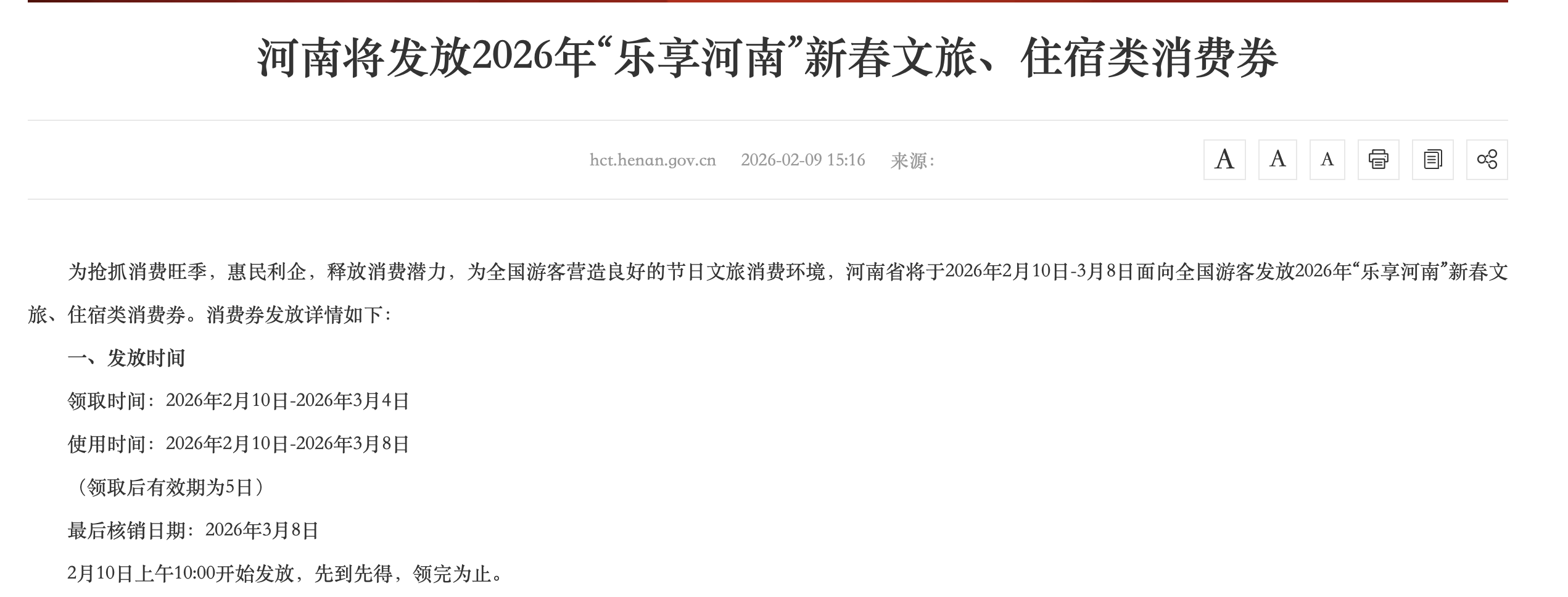 2月9日,据河南省文化和旅游厅公开信息,河南发放2026年“乐享河南”新春文旅、住宿类消费券,领取时间为2月10日至3月4日每天上午10:00,消费券采取折扣券形式,发放8折消费券,门票、演出类产品消费券起用门槛50元,单笔订单最高减免200元;酒店住宿、度假线路类产品消费券起用门槛150元,单笔订单最高减免500元。